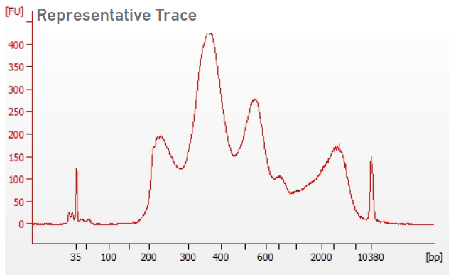 Run 1 μl sample at 1:2 dilution on the Agilent Bioanalyzer High Sensitivity DNA chip to determine fragment size. Select the region between 175-1000 bp to determine average size of ATAC library. Lower molecular weight product (≤ 150 bp) and/or a high molecular weight product (~2,000 bp) may be present. This does not affect sequencing.