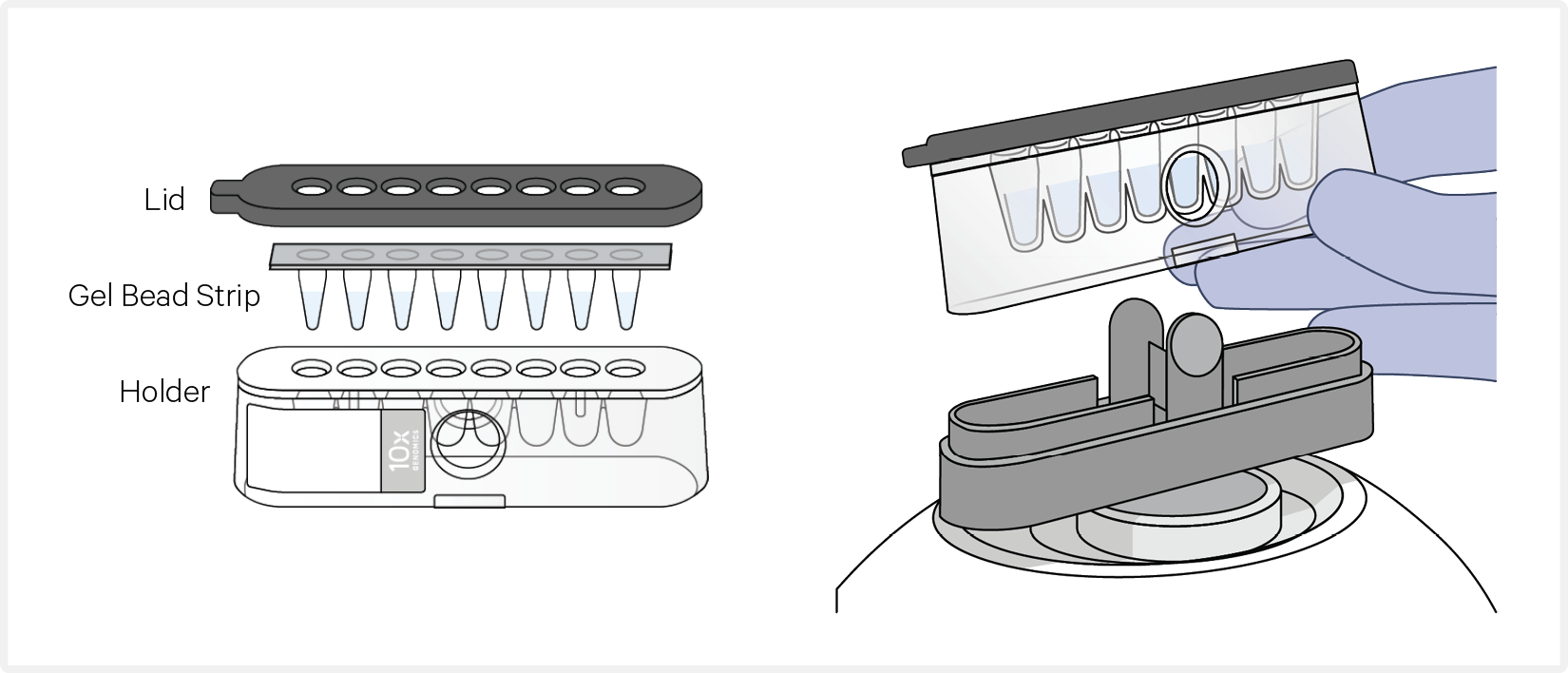Centrifuge the Gel Bead strip for ~5 sec after removing from the holder. Confirm there are no bubbles at the bottom of tubes and the liquid levels look even. Place Gel Bead strip back in the holder and secure the holder lid.
