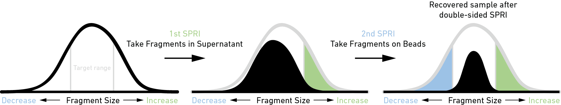 After the first SPRI, supernatant is transferred for a second SPRI while larger fragments are discarded (green). After the second SPRI, fragments on beads are eluted and kept while smaller fragments are discarded (blue). Final sample has a tight fragment size distribution with reduced overall amount (black).