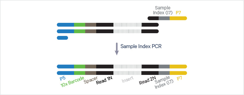 P7 and a sample index are added to pre-amplified transposed DNA during ATAC library construction via PCR. The final ATAC libraries contain the P5 and P7 sequences used in Illumina® amplification.