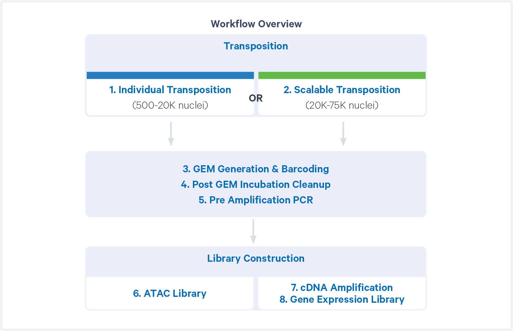 Nuclei suspensions are incubated in a Transposition Mix that includes a Transposase. The Transposase enters the nuclei and preferentially fragments the DNA in open regions of the chromatin. Simultaneously, adapter sequences are added to the ends of the DNA fragments. Depending on starting nuclei input and experimental goals, choose either Individual or Scalable Transposition as per the Transposition Selection Guidelines.
