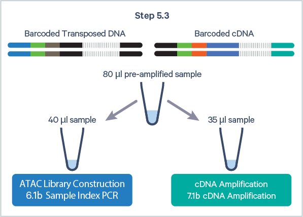 80 μl pre-amplified, SPRI cleaned sample derived at end of step 5.3 includes barcoded transposed DNA fragments and barcoded cDNA.