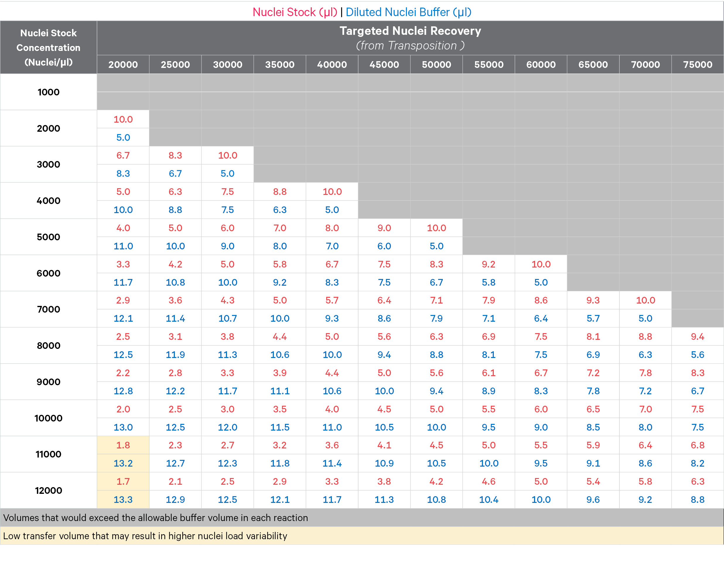 Based on the starting Nuclei Stock Concentration, locate the corresponding row in the table. Identify the exact cell with pre-calculated volumes based on the Targeted Nuclei Recovery. These values already account for a Recovery Efficiency Factor of 1.0 from Transposition.
